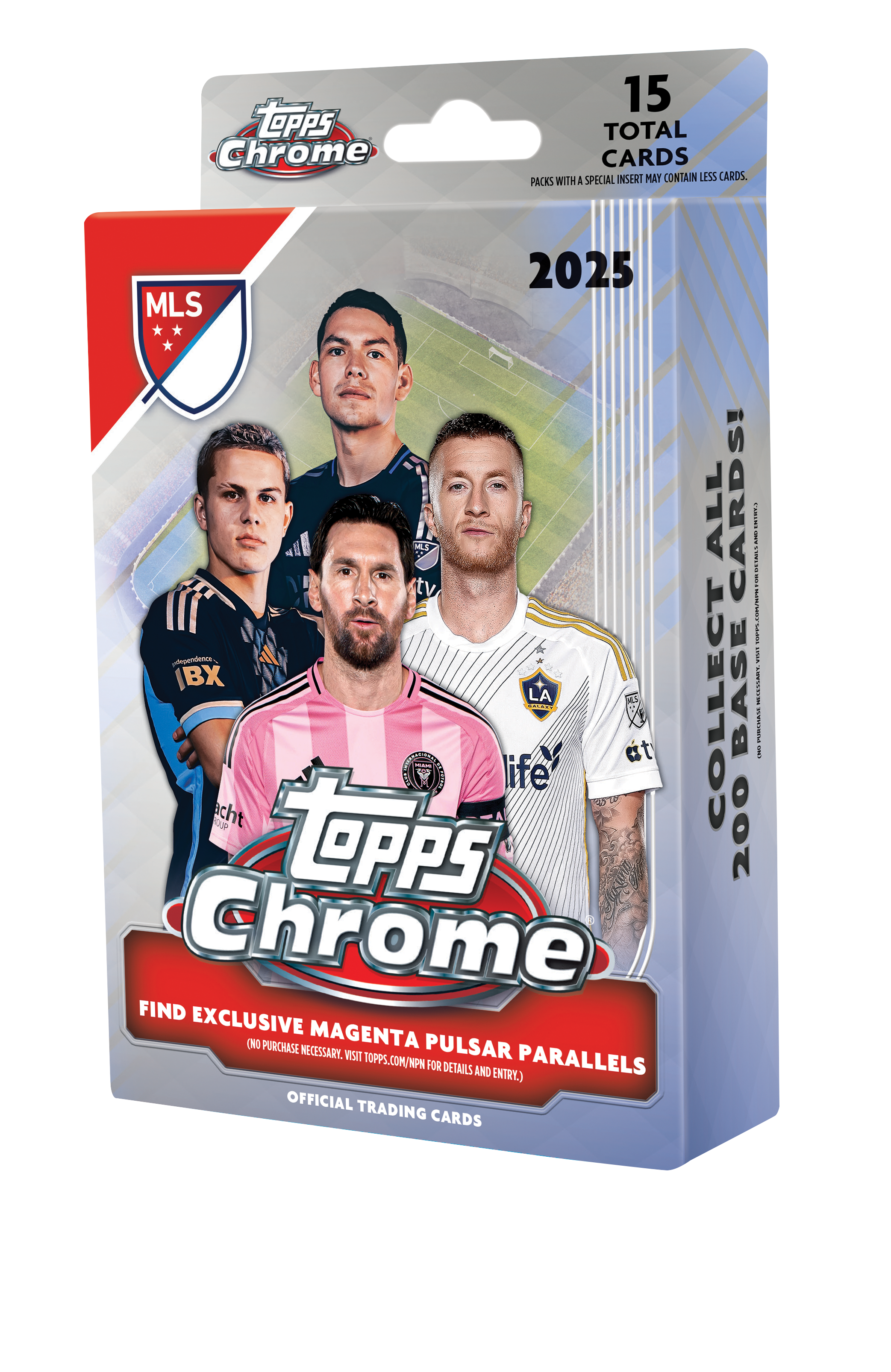Each box contains fifteen 2025 Topps Chrome MLS cards including 3 Exclusive Magenta Pulsar parallels and 2 inserts.