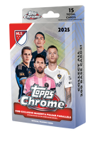 Topps presents the 2025 Topps Chrome MLS Trading Card Hanger Box! Each box contains 15 total cards. Find Exclusive Magenta Pulsar Parallels! Look for rare autographs! Cards imaged are not guaranteed. Content may vary.